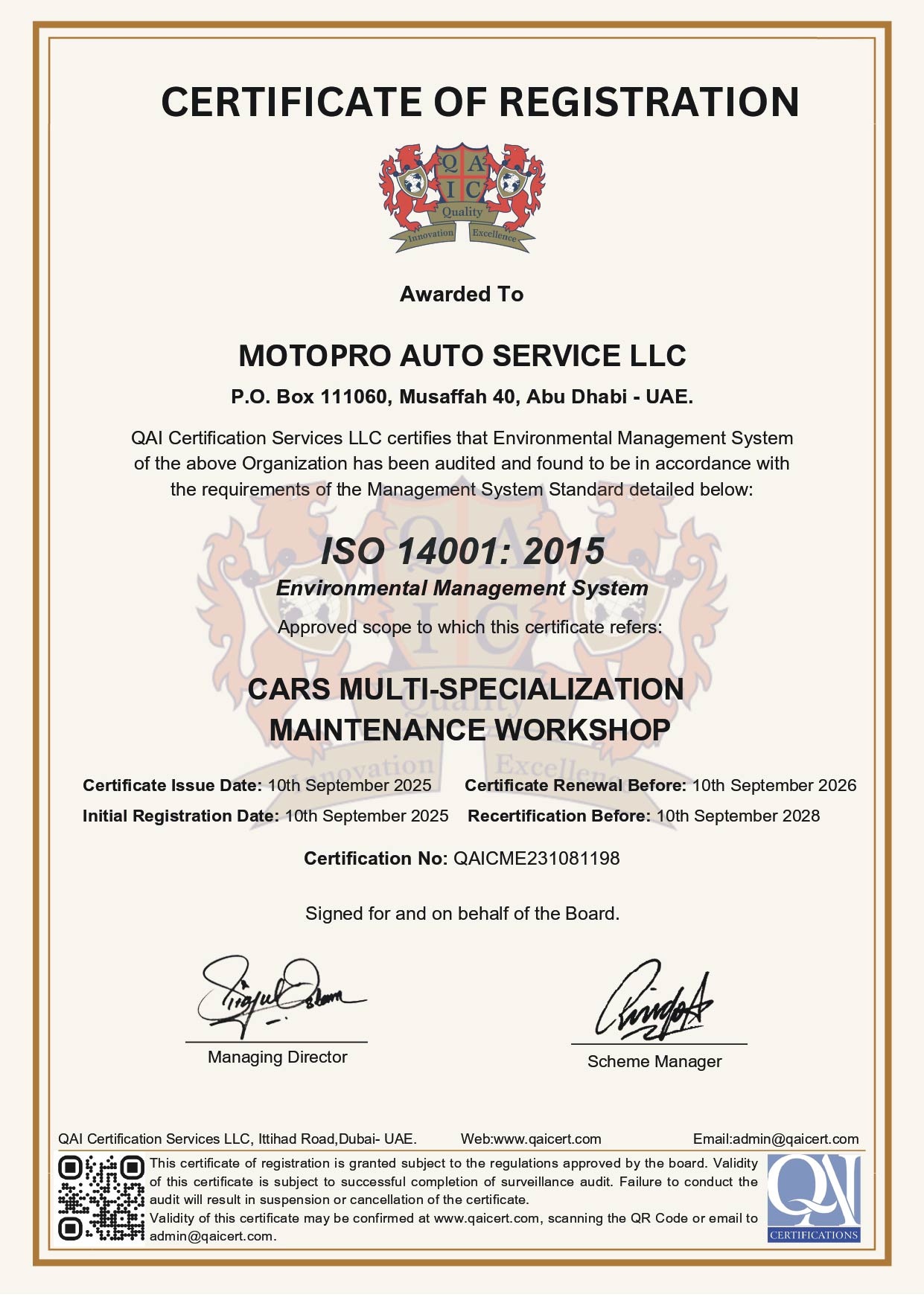 Founded on June 2009, in Abu Dhabi, Motopro Auto Service L.L.C (a subsidiary of DAS Holding L.L.C.) is a limited liability company that became a pioneer within its line of Business, by setting a new trend to workshops outside the local dealerships services centers, thus granting it the ISO registration certificate.