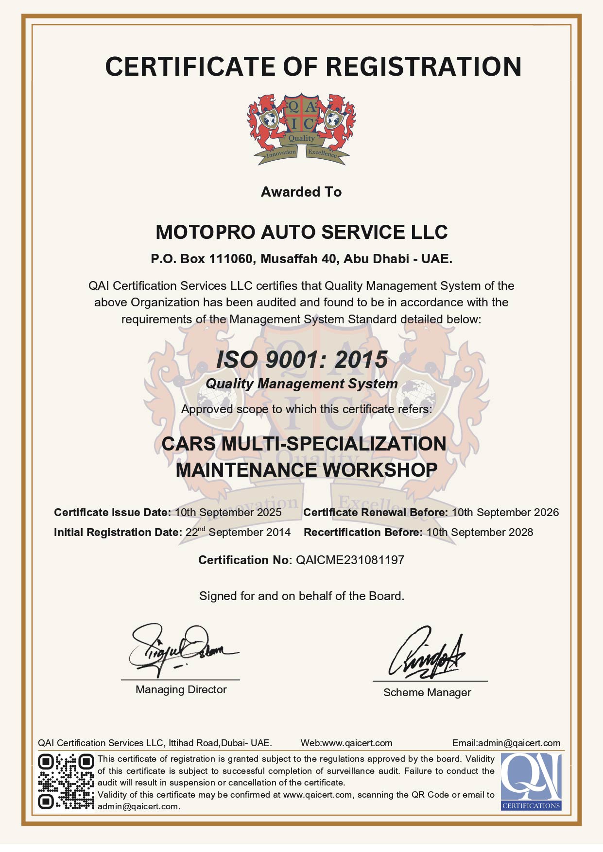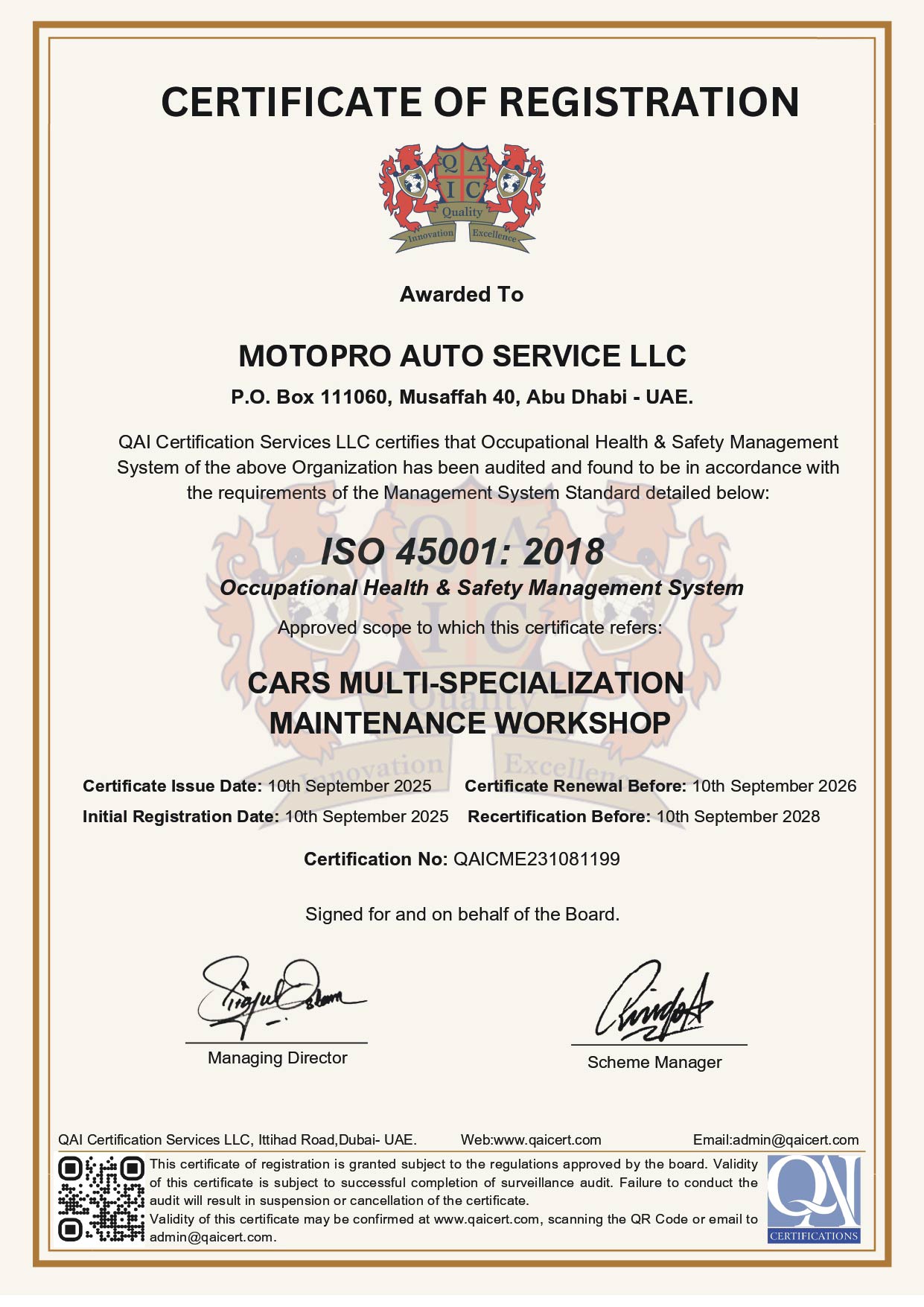 Founded on June 2009, in Abu Dhabi, Motopro Auto Service L.L.C (a subsidiary of DAS Holding L.L.C.) is a limited liability company that became a pioneer within its line of Business, by setting a new trend to workshops outside the local dealerships services centers, thus granting it the ISO registration certificate.
